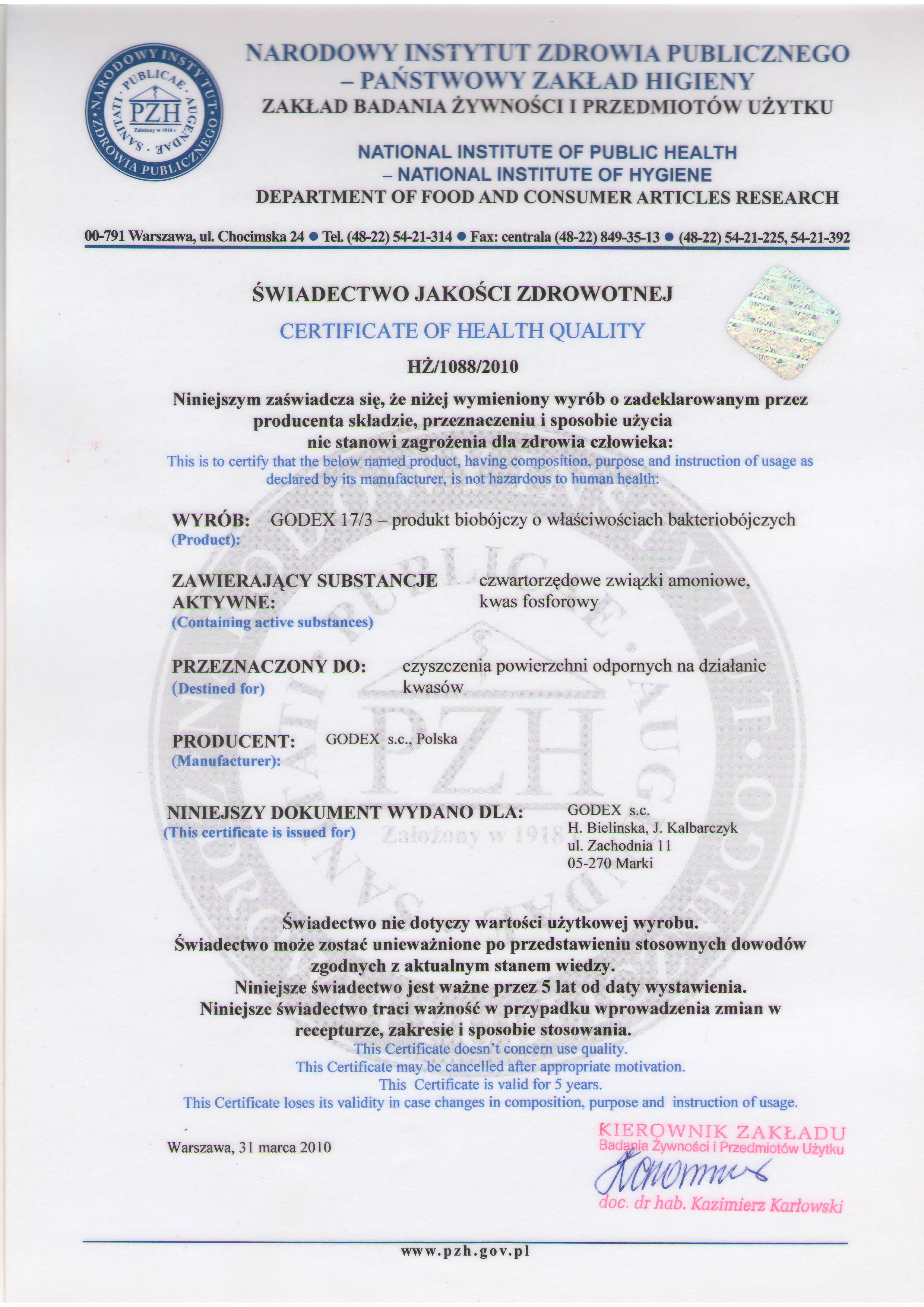 Przeznaczony do gruntownego czyszczenia powierzchni i materiałów odpornych na działanie kwasów. Stosowany do czyszczenia aluminium, mosiądzu, miedzi, stali nierdzewnych, sprzątania po remoncie i budowie. Doskonale czyści sanitariaty, wykazując działanie bakteriobójcze, także w rozcieńczeniu preparatu do 50%.